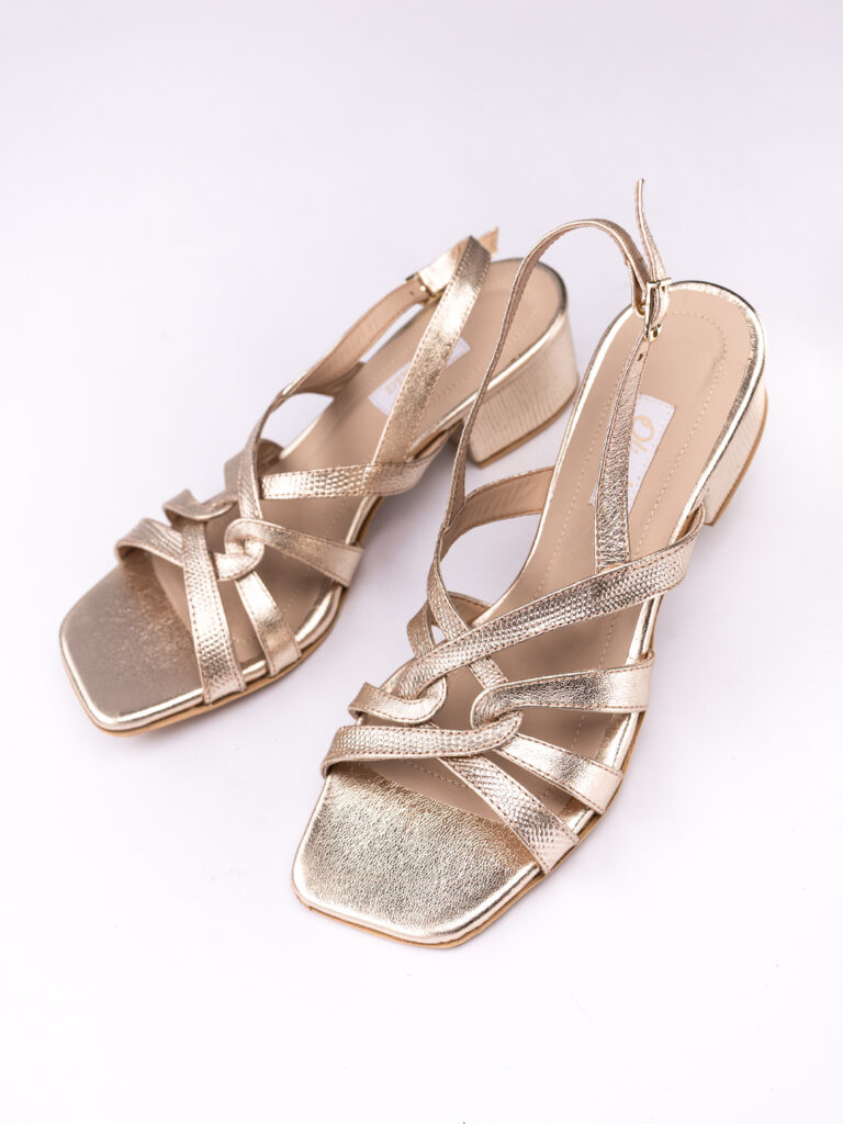 Sandalia cuero dorado lavado tipo graneado, taco 4 grueso.
