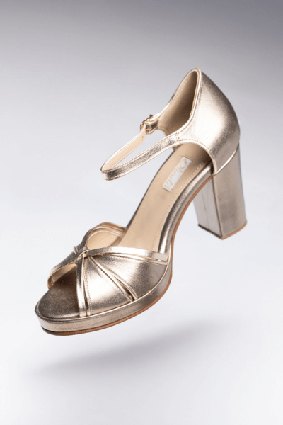 Sandalia tiras cruzadas, peltre con detalles en dorado taco 8 grueso, con plataforma